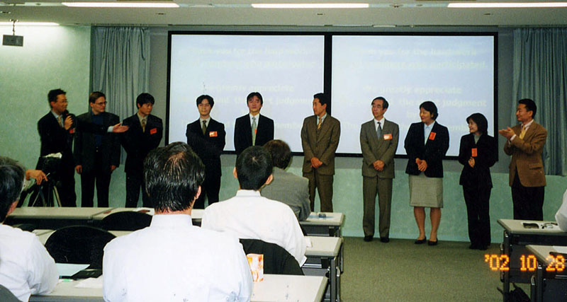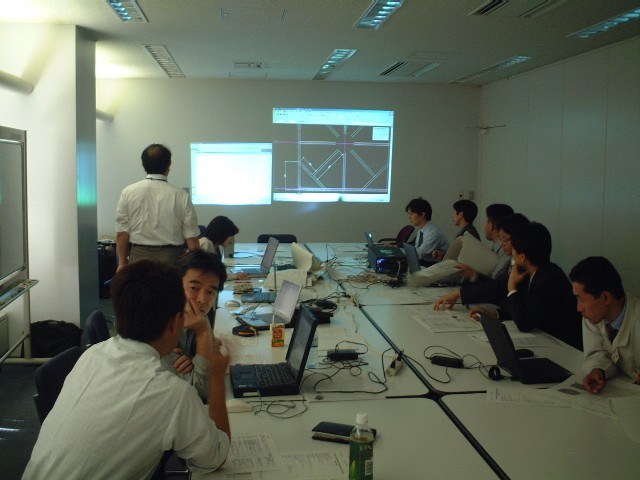| In October 2002, just before autumn in Tokyo, Japanese AEC companies have been organizing weekly workshops to prepare for the coming IFC certification in the end of October 27th to 28th. The picture taken on 17th October, shows their enthusiasm. Kajima (4 applications), Fujitsu (1), Sumitomo Cement System (2) and NEC (1) try to get the certification this time. BLIS correspondant Y.Adachi, Tokyo |